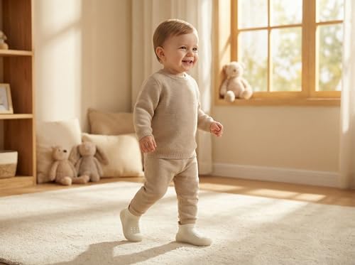 Adorable soft walking socks for little ones. Very flexible, looks and fits like a sock that has a rubber bottom for protection, gripping & can be worn outside if desired. Ideal thickness – not too much & not too little. The neutral tan color is perfect for any outfit and either gender. This color blends to appear like the little one may be bare foot. Highly recommend! Great quality. Great selection of colors & sizes. Whoever came up with these is genius!