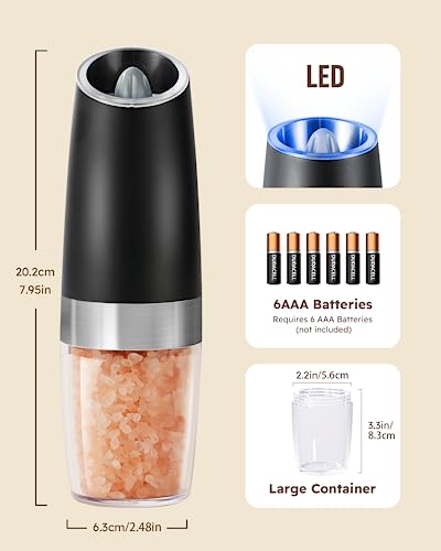 Sangcon Gravity Electric Pepper and Salt Grinder Mill Automatic Shaker Grinder with LED Light, Battery Powered Adjustable Coarseness One Hand…