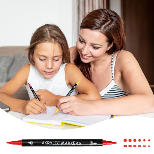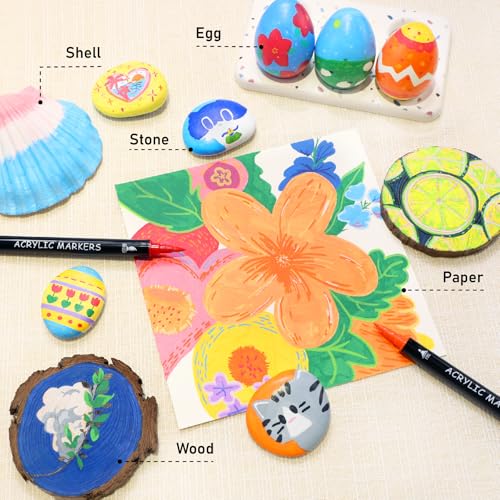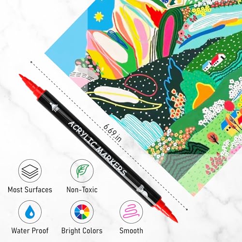 - 【Precision and Versatility in Every Stroke】 The 30-color acrylic paint markers feature dual tips for ultimate control and flexibility. The fine tip (1mm) is perfect for sharp lines, lettering, and detailed designs, while the brush tip (1-5mm) offers bold strokes and the ability to create various textures with ease. Perfect for everything from sketches to large-scale artwork.