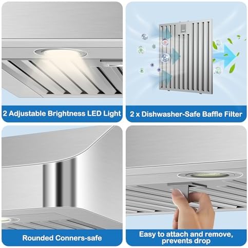 - Machine-washable Stainless Steel Baffle Filters. The kitchen vent hoods equipped with two heavy-duty stainless steel baffle filters, they are heat-resistant and rust-resistant, and can effectively capture grease and impurities. The filters are easy to disassemble and reassemble, and can be directly put into the dishwasher for maintenance-free, long service life, and easy to create a clean kitchen.