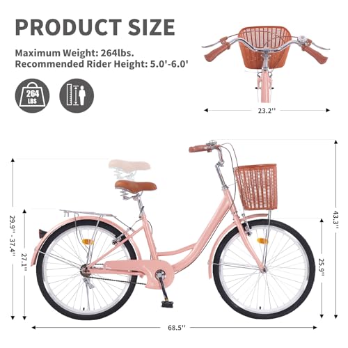 Specification: Adult Comfort Bike for Women, 26Inch Women’ Commuter Bicycle Single Speed with Rear Rack and Basket, Comfortable City Bikes Ergonomic Upright…