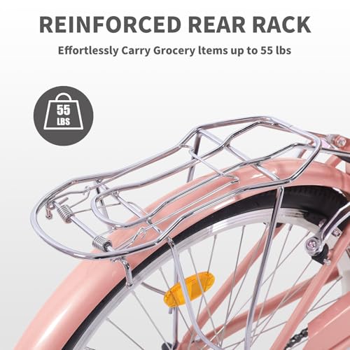 - Practical Accessories: Featuring a spacious rear carrier and a stylish front basket, our women’s bicycle is designed to carry your daily essentials with ease. From groceries to your favorite purse, everything has its place