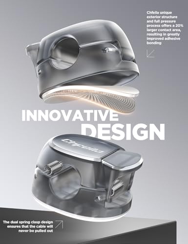 - ✅【Stronger Adhesive Force】Tired of messy cables and sticky residue? Chfeila cord clips offer a superior solution. Our unique bottom structure and full pressure process result in a 20% larger contact area, leading to a stronger adhesive bond. This powerful adhesive ensures a long-lasting, reliable hold on various smooth surfaces, including desks, desktop, wood, glass, ceramic tiles, walls, nightstands and car dashboards. No more worries about your cables falling or damaging your surfaces.