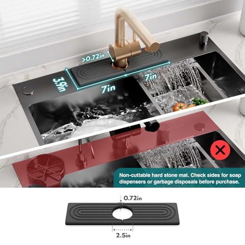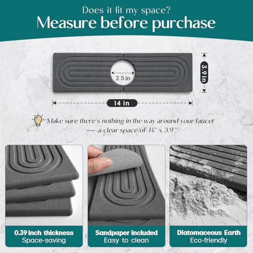 - ๐๐๐๐จ๐ซ๐ ๐ฉ๐ฎ๐ซ๐๐ก๐๐ฌ๐ข๐ง๐ : โ Based on the product size, make sure the stone wonโt cover any sink buttons or dispensers. โ Faucet-to-wall distance must be over 0.72″. โ Faucet base diameter must be under 2.5″. | Size: 14″ x 3.9″ x 0.4″, with a 2.5″ center hole. NON-CUTTABLE HARD STONE MAT.