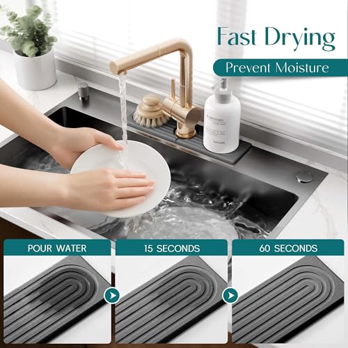I got this for my kitchen sink and it looks really nice. It keeps the area around the faucet dry and clean. The material absorbs water quickly and makes the sink look more organized. I like the modern design and the gray color matches well with my kitchen. Simple but very useful.