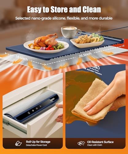 The size is fantastic—26×15 inches gives plenty of space to keep multiple dishes warm at once. It’s perfect for casseroles, skillets, baking trays, or several small plates. The included heat-resistant pad is a great bonus and adds extra safety on delicate surfaces.