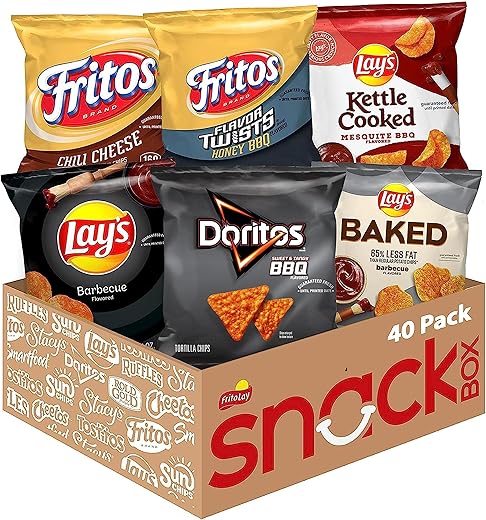 - Includes 40 individually wrapped Barbecue snacks: (8) Lay’s Barbecue, (7) Fritos Twists Honey BBQ, (7) Fritos Chili Cheese, (6) Baked Lay’s Barbecue, (8) Lay’s Kettle Cooked Mesquite BBQ, (4) Doritos Sweet & Tangy BBQ