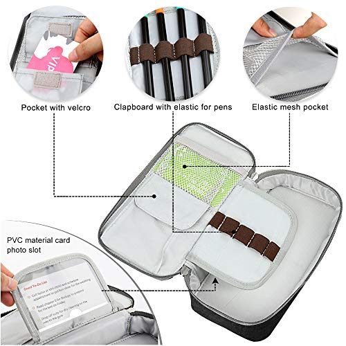 - 【PRAGMATIC CONSTRUCTION】: The inner velcro closed pocket can hold your cards, sticky notes or changes, The mesh pocket can keep your usb cable or ear buds well in place, The center hard flap with pen loops can hold 6 pieces frequently used pens for a quick access, The back of the flap with a transparent card/photo slot.