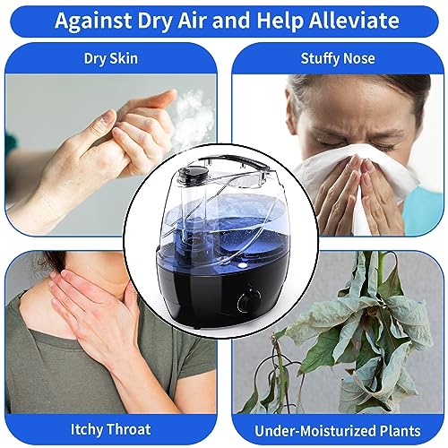 - All-day Comfort & Large Easy-Fill Tank:The Cool Mist Humidifiers delivers hassle-free humidifying up to 30Hrs. 2.2liter water tank provides ideal coverage for bedrooms, offices, nurseries, and other medium-sized rooms. Just fill, turn it on, and breathe easy.