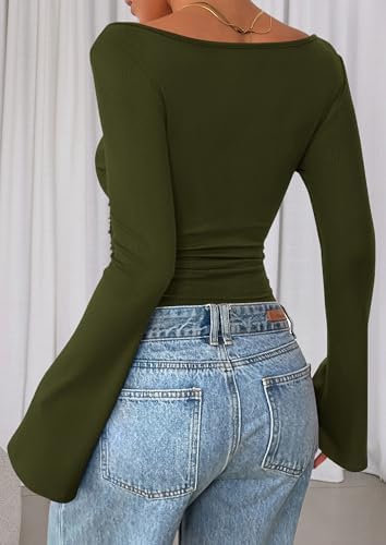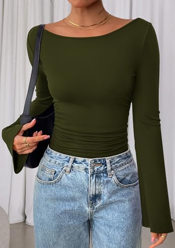PRETTYGARDEN Women’s Long Sleeve Shirts 2025 Fall Crop Going Out Tops Casual Boat Neck Bell Sleeve Ribbed Ruched Y2K Clothes