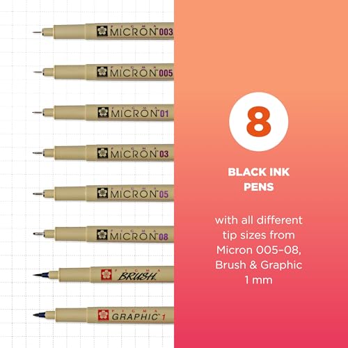 - Assorted Point Sizes: Contains 1 of each Micron pen: 005, 01, 02, 03, 05, 08, Brush, & Graphic 1.0mm